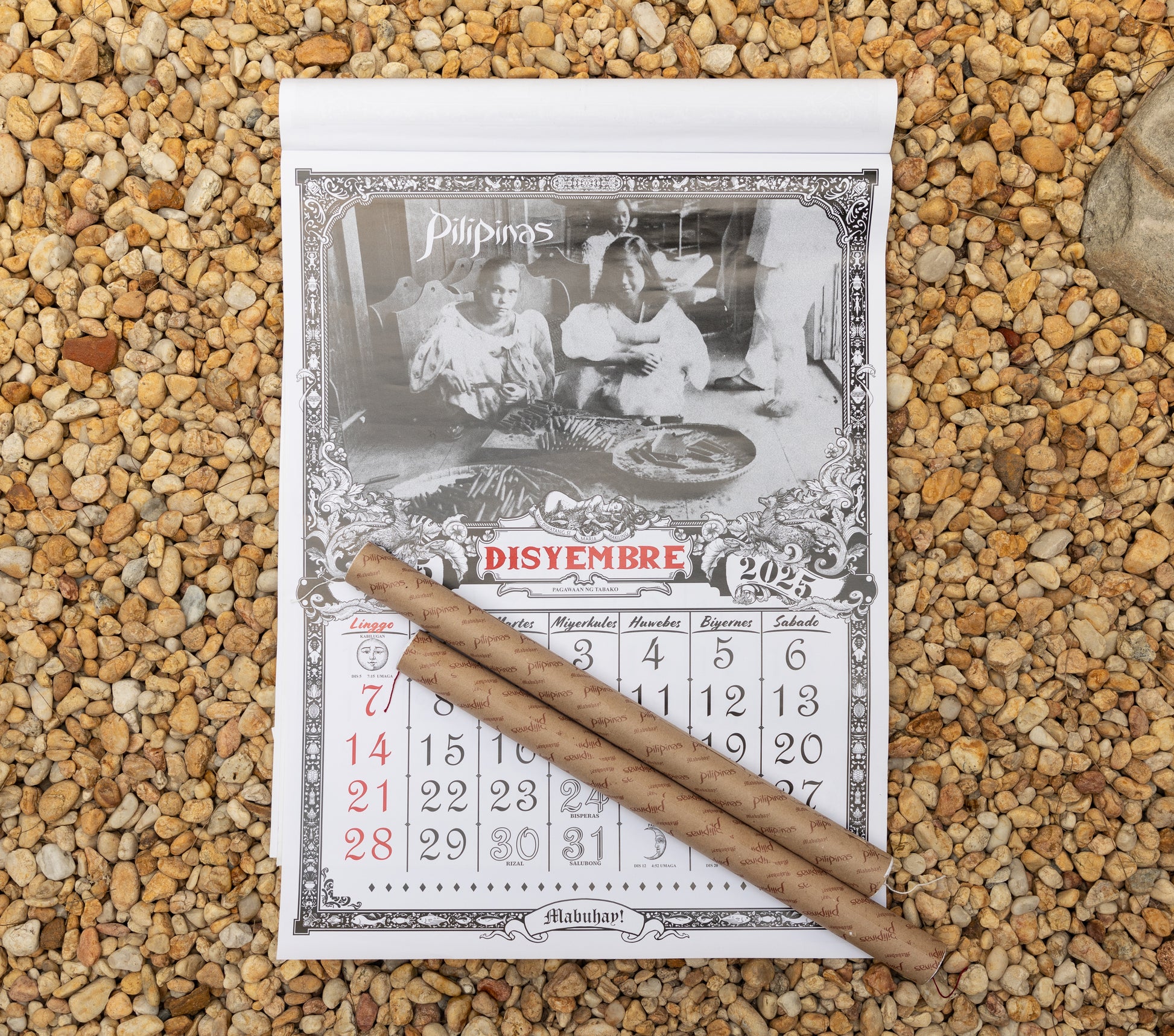 A year-long celebration of Filipino historical and cultural imagery, the calendar features vintage visuals of village fisherfolk, hemp plant growers, tobacco workers, and eel sellers across Tondo, Baguio, Manila, Hagonoy and more. The calendar text is listed in Tagalog, with the design paying ode to the traditional Filipino calendar aesthetic. Printed on premium paper by IMPRINTA13 and encased inside a stylish cardboard tube.